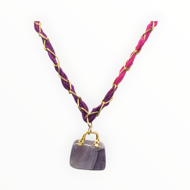 Au centre, un pendentif en améthyste naturelle, taillé en forme de petit sac à main, capte le regard par sa forme originale et ses reflets profonds. Mais sa beauté va bien au-delà de l’esthétique : l’améthyste est une alliée puissante pour l’âme et l’esprit.