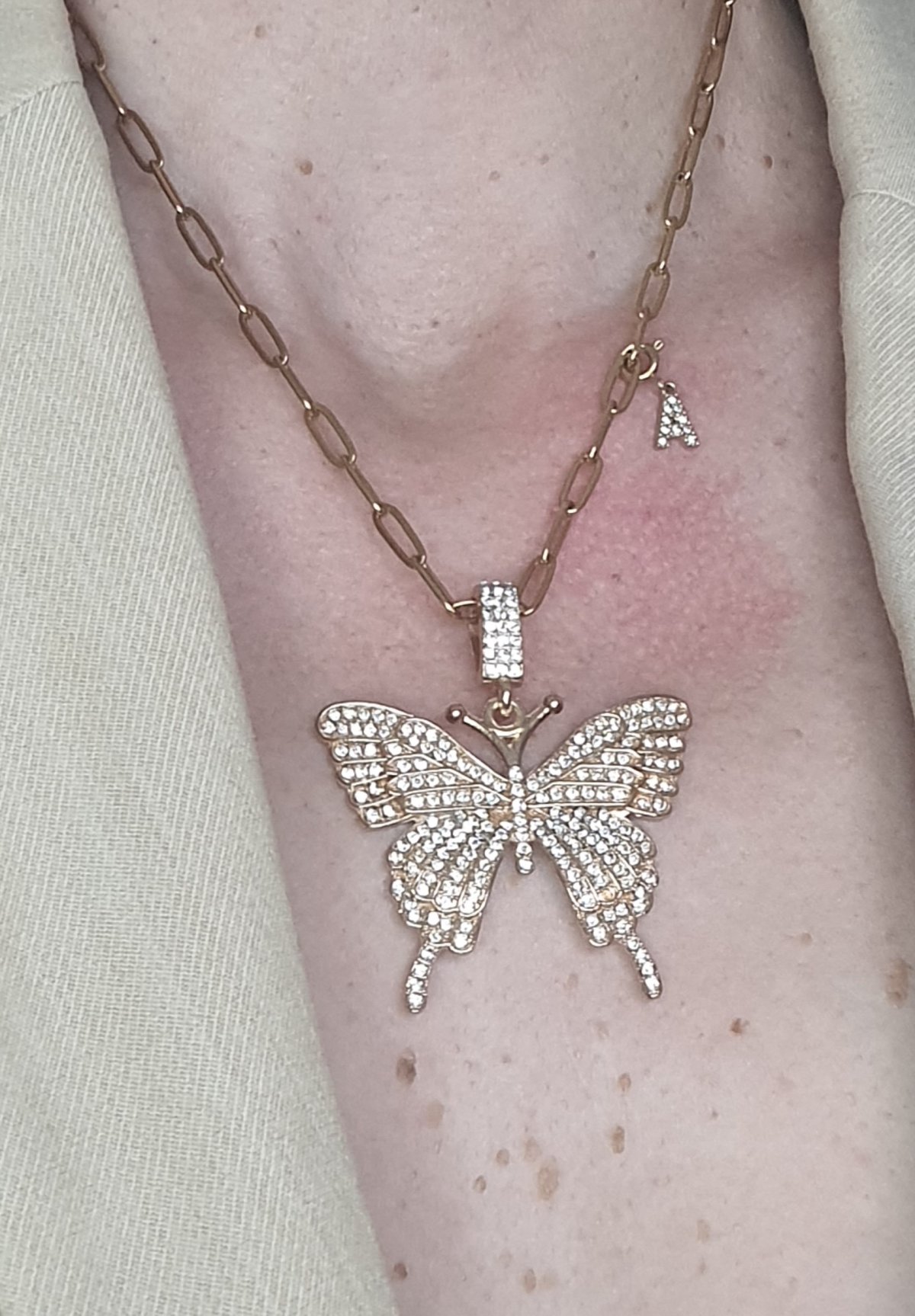 Forme : Papillon doré orné de strass lumineux, pendentif lettre