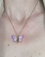 Son papillon en acrylique violet, éclatant et aérien, représente le changement, la liberté et la renaissance, rappelant que chaque transformation mène vers une nouvelle version de soi-même. Associé à une chaîne en acier inoxydable doré, il allie durabilité et éclat intemporel.