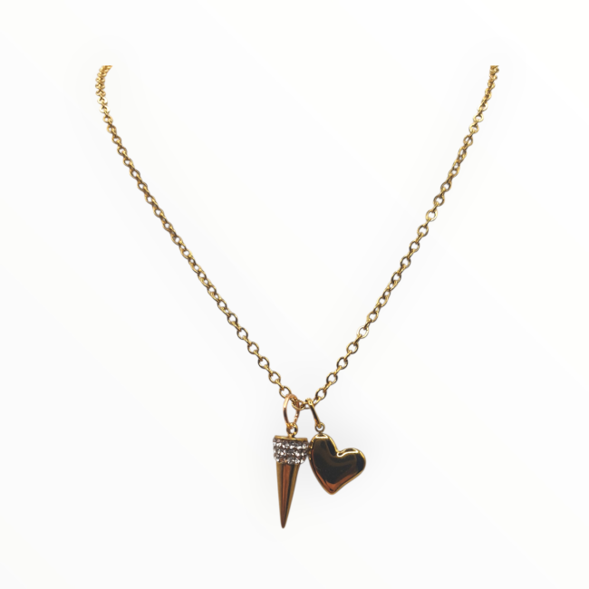 Le collier Soléna est un bijou plein de sens, conçu pour allier beauté et énergie. Il est composé d’un pendentif en forme de cœur et d’une petite breloque conique.