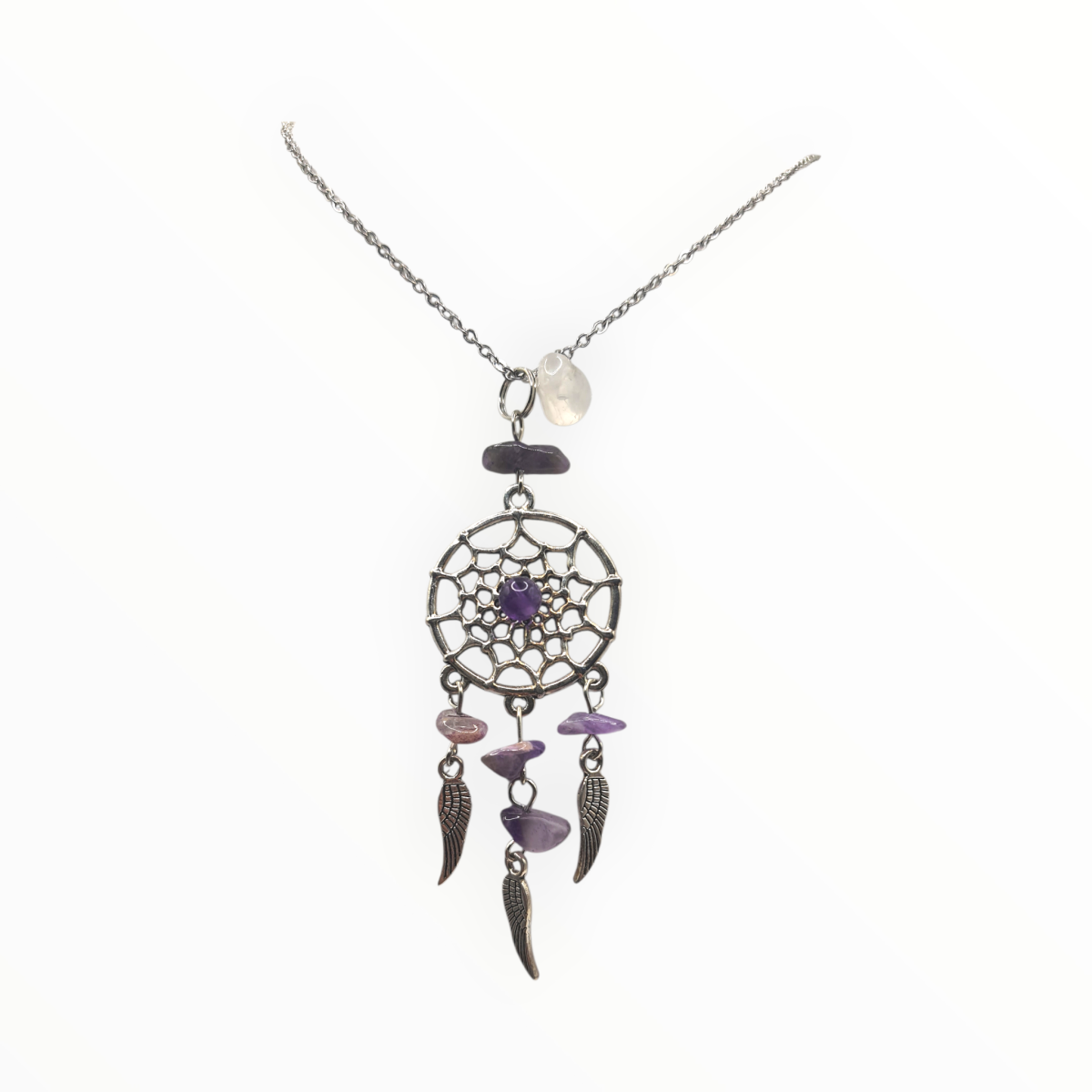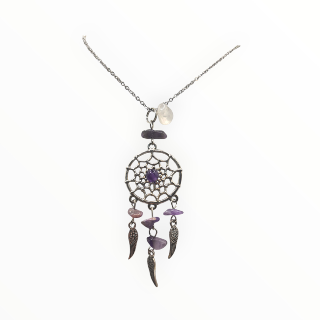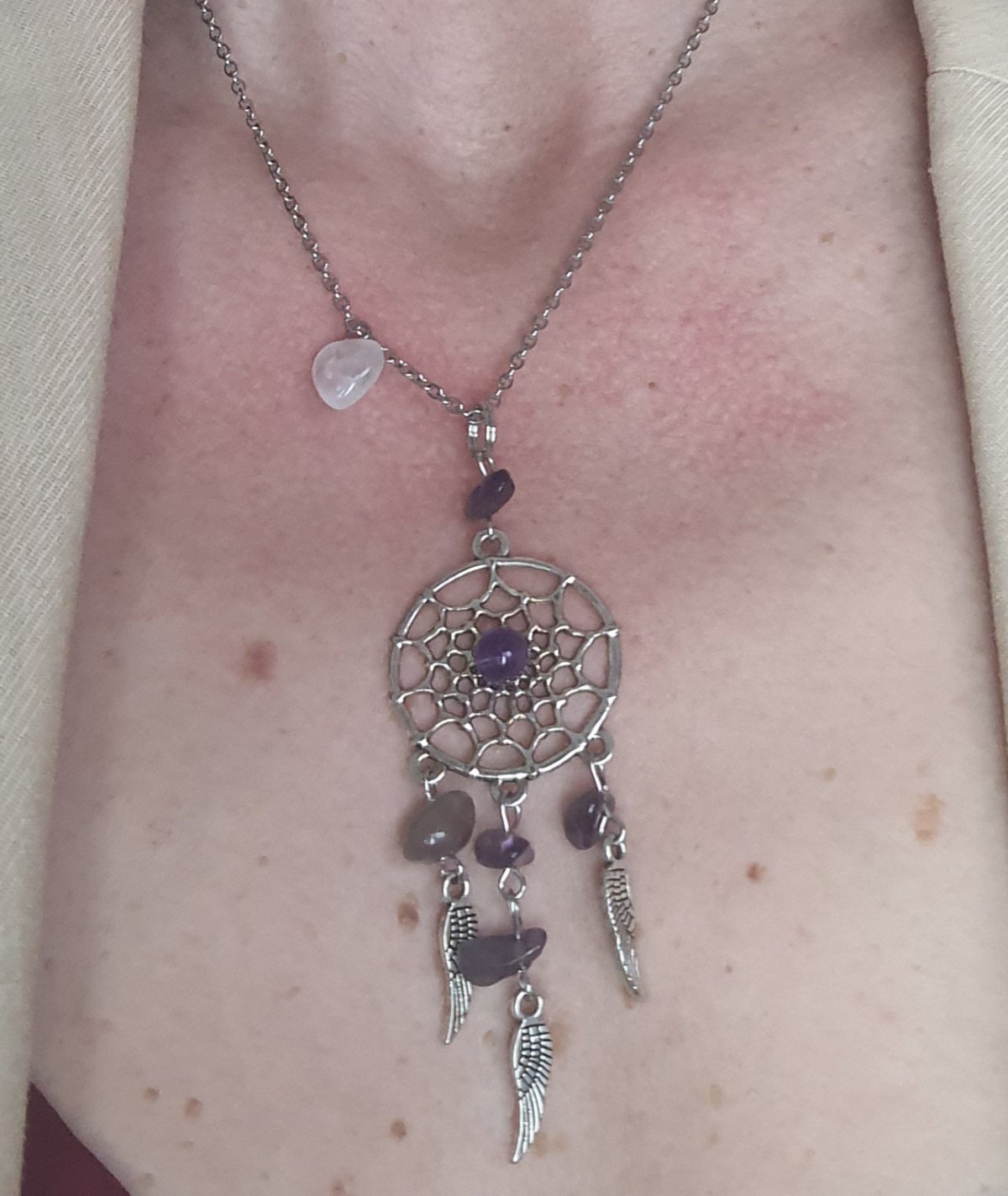 Matériaux : Attrape-rêve argenté avec pierres naturelles, breloques en forme de cœur et chaine en acier inoxydable.